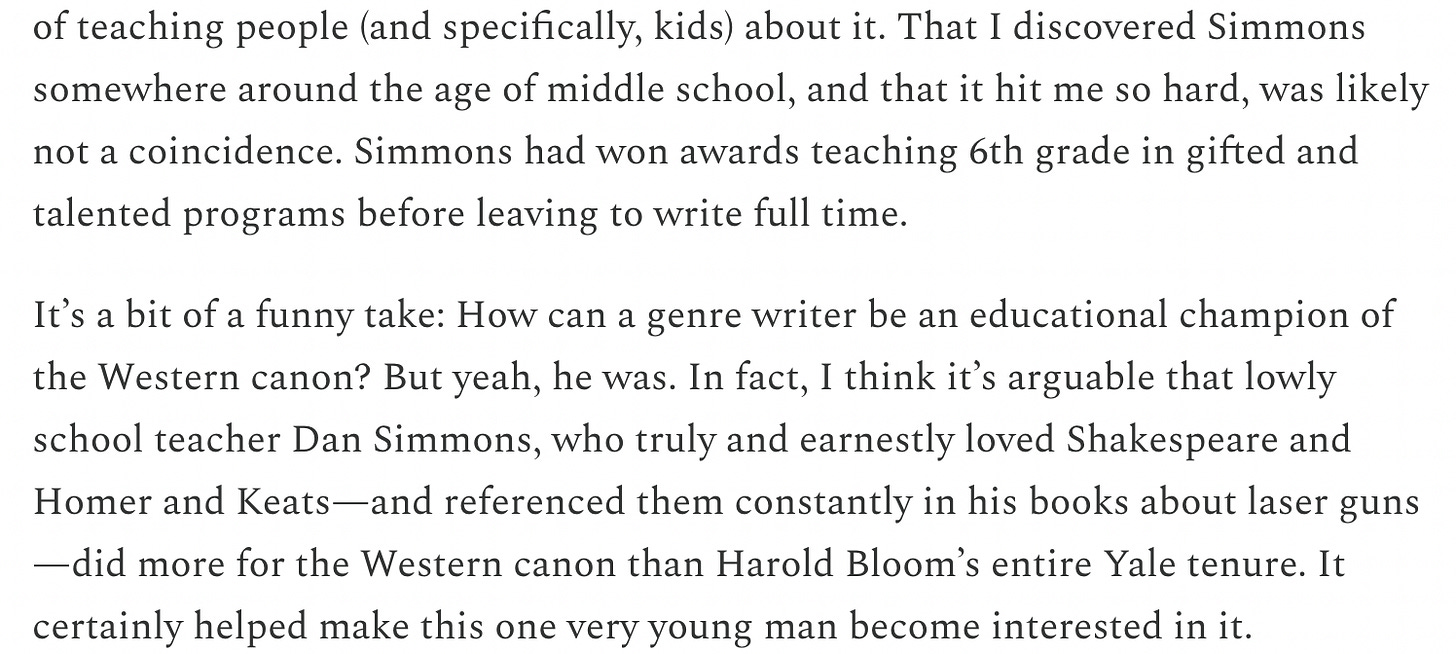 I was going to write an ode to Dan Simmons, the polymathic author of the Hyperion Cantos, one of the great pillars of the 20th century sci fi canon. But then Eric Hoel wrote a better one than I possibly could have. This guy is worth subscribing to if you like weird philosophical stuff that makes you smarter. Here he is on Simmons: