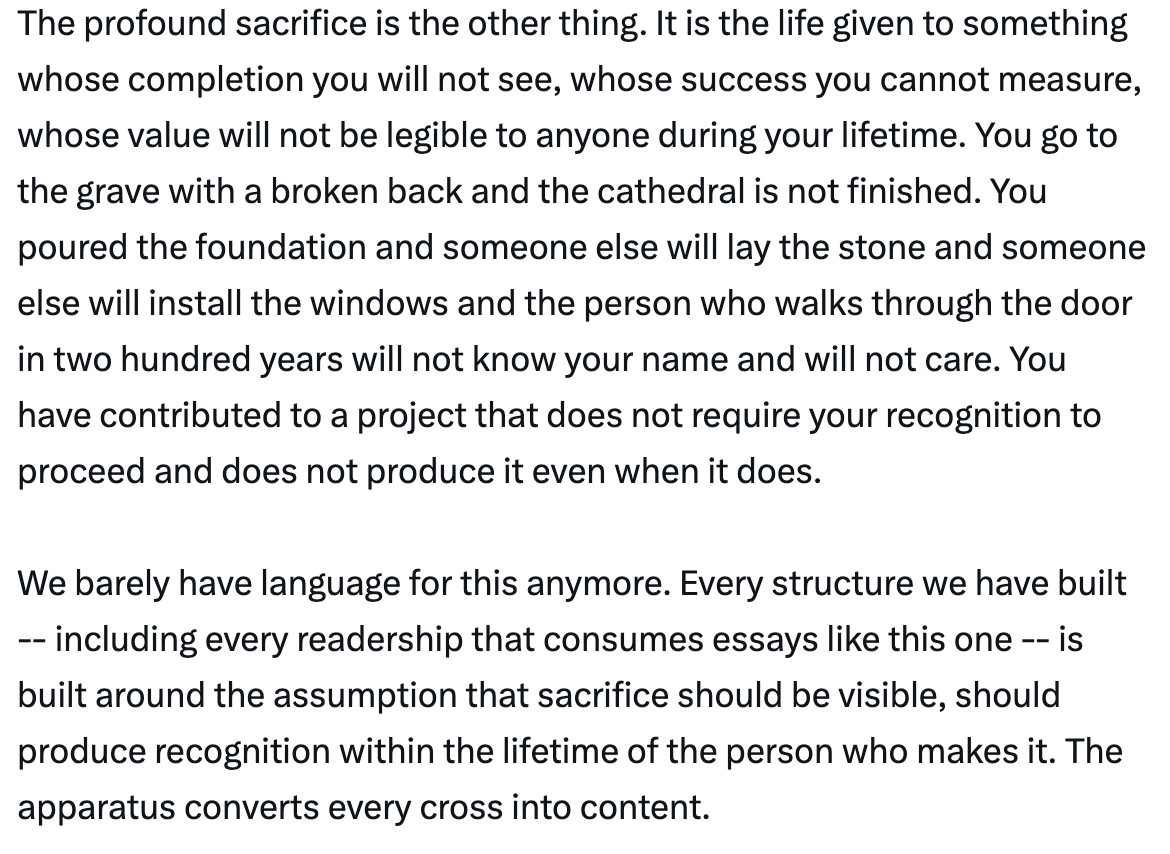 It feels so good to read something like this and think “there’s absolutely no way an A.I. wrote this”. Maybe that won’t always be true, but it is now. Just the entire perspective of that graf is so human. And this: